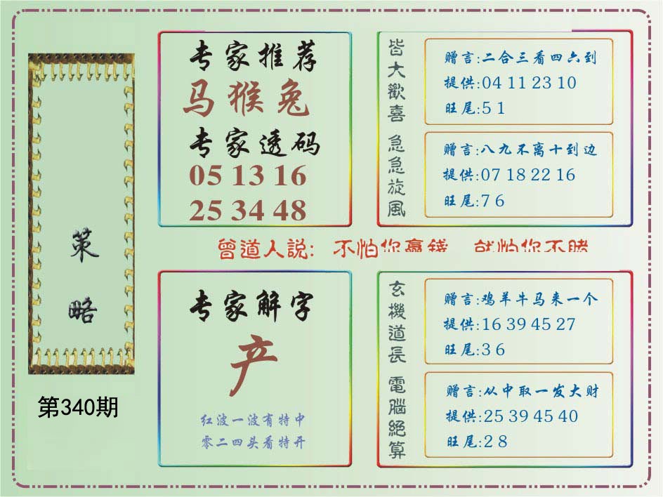 | 340期:内部一肖一码:(虎27)下注20万.信心100%.请把握机会! |