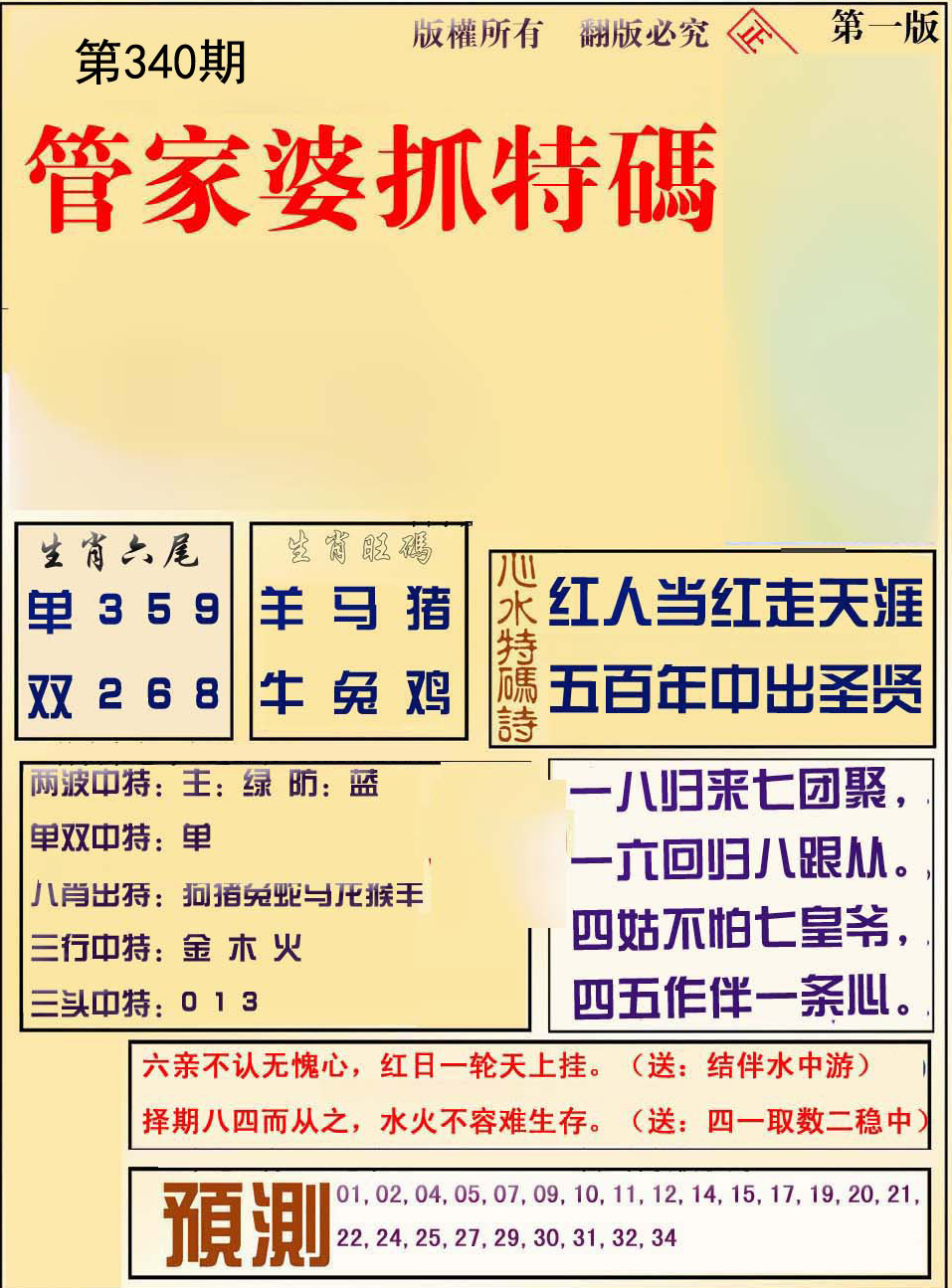 330期:今期生肖出三四,吃肉之肖人人知。送:四来六来开虎40 |